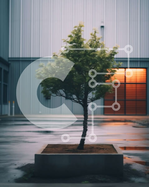 Intra Συλλεκτικό Ξύλινο Παζλ Plywood 4mm – Μοναχικό δέντρο σε ένα χώρο στάθμευσης με γκρίζο ουρανό και κόκκινο κτίριο Σε Ξύλινο Κουτί – Διαστάσεις Puzzle: 10×10 cm – 25 κομμάτια
