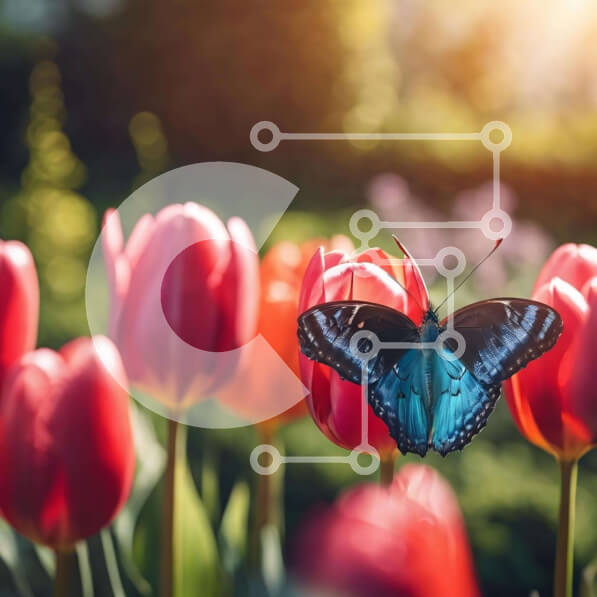 Intra Συλλεκτικό Ξύλινο Παζλ Plywood 4mm – Μπλε πεταλούδα στις κόκκινες τουλίπες στο φως του ήλιου Σε Ξύλινο Κουτί – Διαστάσεις: 10×10 cm – 25 κομμάτια