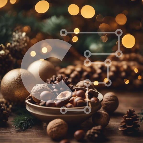 Intra Συλλεκτικό Ξύλινο Παζλ Plywood 4mm – Μπολ με ξηρούς καρπούς, κουκουνάρια και στολίδια σε ένα διακοσμημένο ξύλινο τραπέζι Σε Ξύλινο Κουτί – Διαστάσεις: 10×10 cm – 25 κομμάτια
