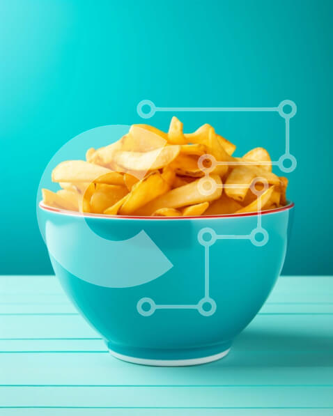 Intra Συλλεκτικό Ξύλινο Παζλ Plywood 4mm – Μπολ με τηγανιτές πατάτες σε ένα μπλε τραπέζι Σε Ξύλινο Κουτί – Διαστάσεις: 10×10 cm – 25 κομμάτια