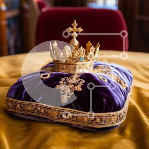 Intra Συλλεκτικό Ξύλινο Παζλ Plywood 4mm – Μωβ και χρυσό στέμμα μαξιλάρι σε κίτρινο τραπεζομάντιλο Σε Ξύλινο Κουτί – Διαστάσεις: 10×10 cm – 25 κομμάτια