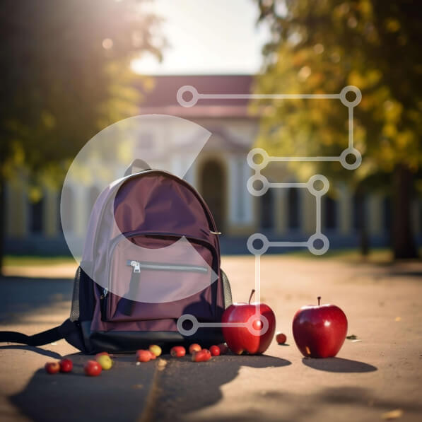 Intra Συλλεκτικό Ξύλινο Παζλ Plywood 4mm – Μωβ σακίδιο πλάτης δίπλα σε δύο μήλα Σε Ξύλινο Κουτί – Διαστάσεις Puzzle: 10×10 cm – 25 κομμάτια