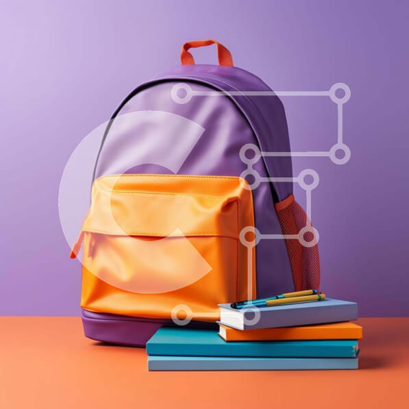 Intra Συλλεκτικό Ξύλινο Παζλ Plywood 4mm – Μωβ σακίδιο πλάτης, μπλε και πορτοκαλί βιβλία και στυλό σε πορτοκαλί φόντο Σε Ξύλινο Κουτί – Διαστάσεις Puzzle: 10×10 cm – 25 κομμάτια