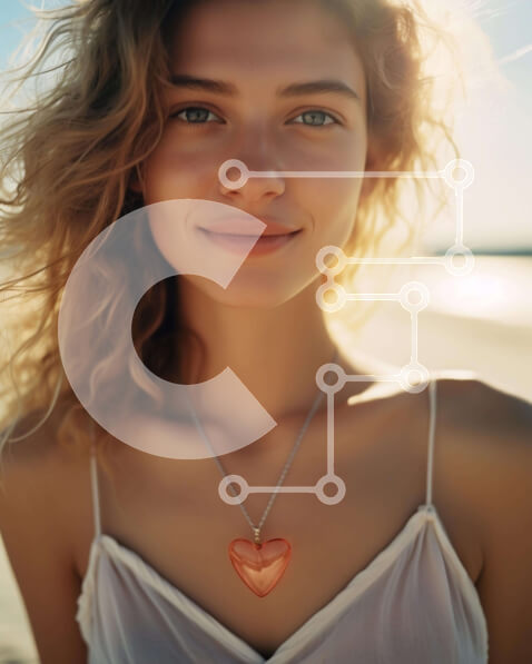 Intra Συλλεκτικό Ξύλινο Παζλ Plywood 4mm – Νεαρή γυναίκα στην παραλία με πορτοκαλί κολιέ σε σχήμα καρδιάς Σε Ξύλινο Κουτί – Διαστάσεις Puzzle: 10×10 cm – 25 κομμάτια