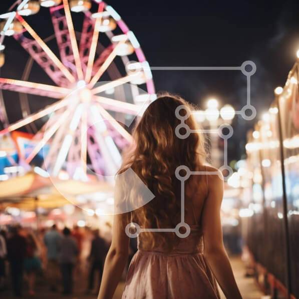 Intra Συλλεκτικό Ξύλινο Παζλ Plywood 4mm – Νεαρή γυναίκα σε νυχτερινό εκθεσιακό χώρο με ρόδα λούνα παρκ Σε Ξύλινο Κουτί – Διαστάσεις Puzzle: 10×10 cm – 25 κομμάτια
