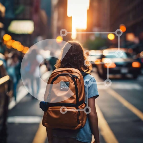 Intra Συλλεκτικό Ξύλινο Παζλ Plywood 4mm – Νεαρή γυναίκα που περπατά στην πόλη με πορτοκαλί σακίδιο Σε Ξύλινο Κουτί – Διαστάσεις Puzzle: 10×10 cm – 25 κομμάτια