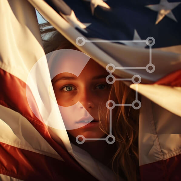 Intra Συλλεκτικό Ξύλινο Παζλ Plywood 4mm – Νεαρή γυναίκα που κρυφοκοιτάζει πίσω από την αμερικανική σημαία Σε Ξύλινο Κουτί – Διαστάσεις Puzzle: 10×10 cm – 25 κομμάτια