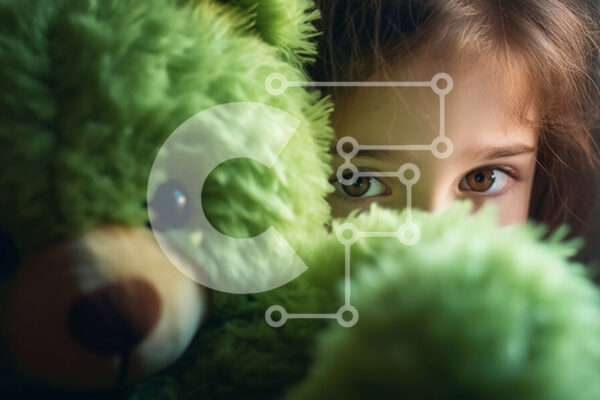 Intra Συλλεκτικό Ξύλινο Παζλ Plywood 4mm – Νεαρό κορίτσι με μακριά καστανά μαλλιά που κρυφοκοιτάζει πίσω από ένα μεγάλο πράσινο αρκουδάκι Σε Ξύλινο Κουτί – Διαστάσεις Puzzle: 10×10 cm – 25 κομμάτια