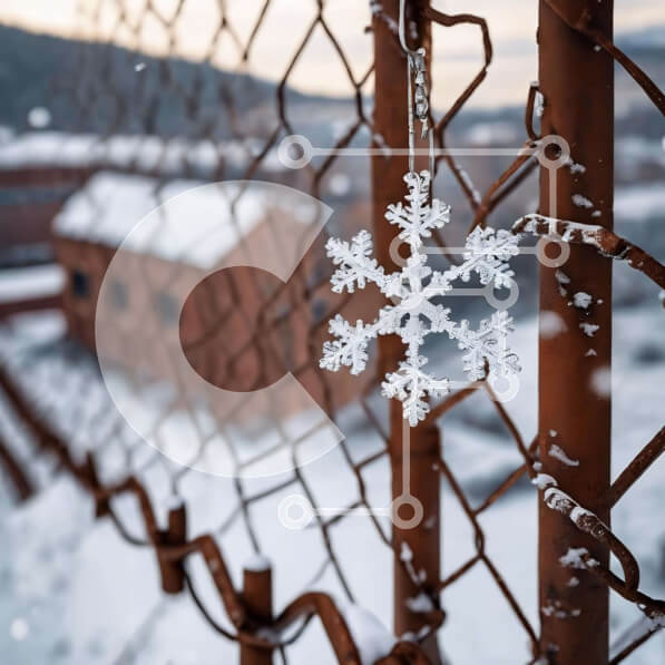 Intra Συλλεκτικό Ξύλινο Παζλ Plywood 4mm – Νιφάδα χιονιού που κρέμεται από φράχτη με αλυσίδες μπροστά από το βιομηχανικό κτίριο Σε Ξύλινο Κουτί – Διαστάσεις Puzzle: 10×10 cm – 25 κομμάτια