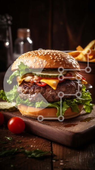 Intra Συλλεκτικό Ξύλινο Παζλ Plywood 4mm – Νόστιμη εικόνα ενός Cheeseburger με μαρούλι, ντομάτα και τηγανιτές πατάτες σε ένα ξύλινο τραπέζι Σε Ξύλινο Κουτί – Διαστάσεις: 10×10 cm – 25 κομμάτια