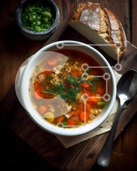 Intra Συλλεκτικό Ξύλινο Παζλ Plywood 4mm – Νόστιμη σούπα λαχανικών σε ένα ξύλινο τραπέζι με φρέσκα βότανα και ψωμί Σε Ξύλινο Κουτί – Διαστάσεις: 10×10 cm – 25 κομμάτια