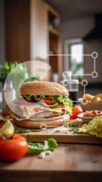 Intra Συλλεκτικό Ξύλινο Παζλ Plywood 4mm – Νόστιμο χάμπουργκερ με μαρούλι, ντομάτα και τυρί σε μια ξύλινη σανίδα κοπής σε μια κουζίνα Σε Ξύλινο Κουτί – Διαστάσεις: 10×10 cm – 25 κομμάτια