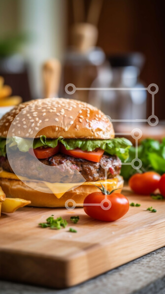 Intra Συλλεκτικό Ξύλινο Παζλ Plywood 4mm – Νόστιμο Cheeseburger και πατάτες σε ξύλινο ξύλο κοπής Σε Ξύλινο Κουτί – Διαστάσεις: 10×10 cm – 25 κομμάτια