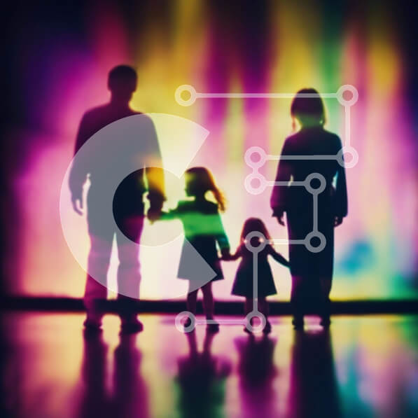 Intra Συλλεκτικό Ξύλινο Παζλ Plywood 4mm – Οικογενειακή σιλουέτα μπροστά από πολύχρωμο αφηρημένο φόντο Σε Ξύλινο Κουτί – Διαστάσεις Puzzle: 10×10 cm – 25 κομμάτια