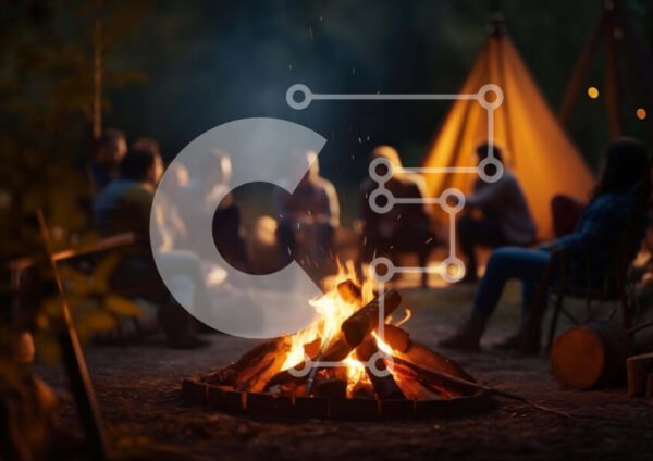 Intra Συλλεκτικό Ξύλινο Παζλ Plywood 4mm – Ομάδα ανθρώπων γύρω από μια φωτιά μπροστά από σκηνές και καρέκλες Σε Ξύλινο Κουτί – Διαστάσεις Puzzle: 10×10 cm – 25 κομμάτια