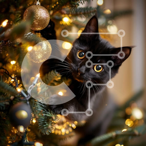 Intra Συλλεκτικό Ξύλινο Παζλ Plywood 4mm – Παιχνιδιάρικη μαύρη γάτα ανάμεσα σε διακοσμήσεις χριστουγεννιάτικων δέντρων Σε Ξύλινο Κουτί – Διαστάσεις: 10×10 cm – 25 κομμάτια
