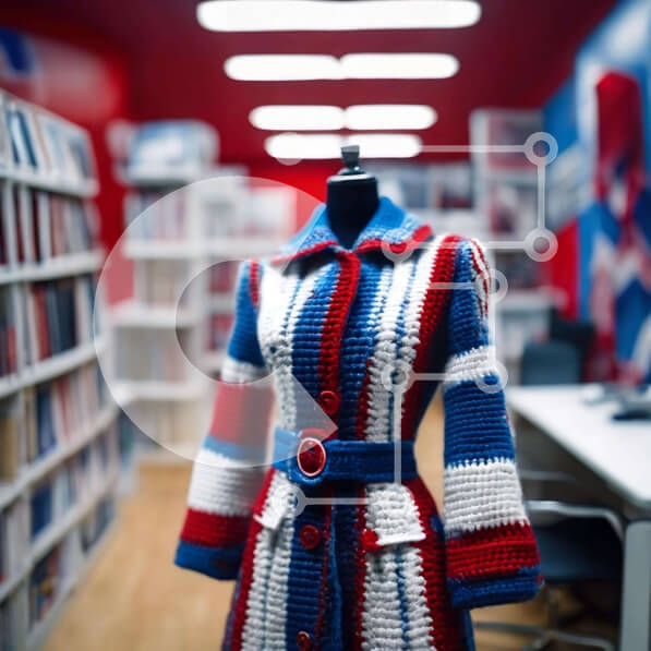 Intra Συλλεκτικό Ξύλινο Παζλ Plywood 4mm – Παλτό με κροσέ κόκκινο, λευκό και μπλε που εμφανίζεται σε ένα άδειο δωμάτιο Σε Ξύλινο Κουτί – Διαστάσεις Puzzle: 10×10 cm – 25 κομμάτια