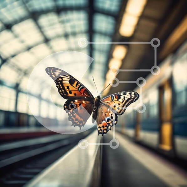 Intra Συλλεκτικό Ξύλινο Παζλ Plywood 4mm – Πεταλούδα σε εσωτερικό σιδηροδρομικό σταθμό με διερχόμενα τρένα Σε Ξύλινο Κουτί – Διαστάσεις: 10×10 cm – 25 κομμάτια