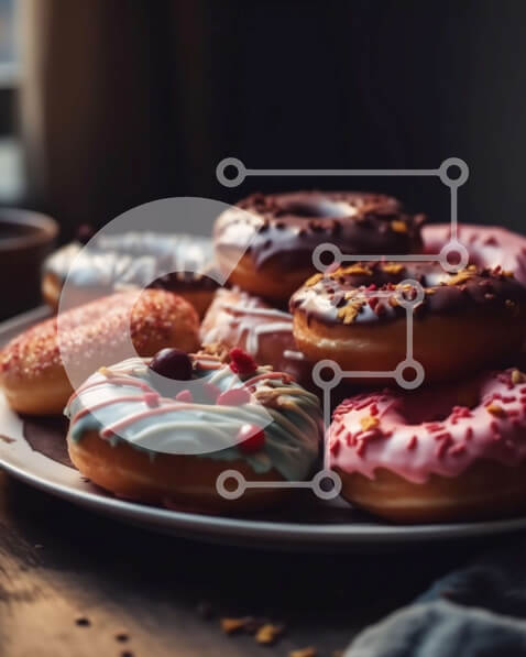 Intra Συλλεκτικό Ξύλινο Παζλ Plywood 4mm – Πιάτο με πολύχρωμα γυαλισμένα ντόνατς σε ένα ξύλινο τραπέζι με θέα στον ορίζοντα της πόλης Σε Ξύλινο Κουτί – Διαστάσεις: 10×10 cm – 25 κομμάτια