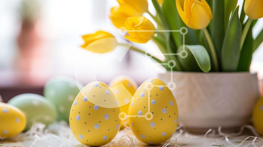 Intra Συλλεκτικό Ξύλινο Παζλ Plywood 4mm – Πολύχρωμα Πασχαλινά αυγά και κίτρινες τουλίπες σε ένα τραπέζι Σε Ξύλινο Κουτί – Διαστάσεις: 10×10 cm – 25 κομμάτια