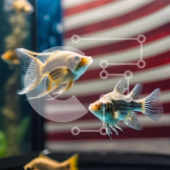Intra Συλλεκτικό Ξύλινο Παζλ Plywood 4mm – Πολύχρωμα ψάρια που κολυμπούν στο ενυδρείο με φόντο την αμερικανική σημαία Σε Ξύλινο Κουτί – Διαστάσεις: 10×10 cm – 25 κομμάτια