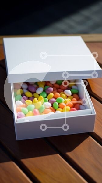Intra Συλλεκτικό Ξύλινο Παζλ Plywood 4mm – Πολύχρωμα φασόλια ζελέ σε λευκό κουτί σε ξύλινο τραπέζι Σε Ξύλινο Κουτί – Διαστάσεις: 10×10 cm – 25 κομμάτια