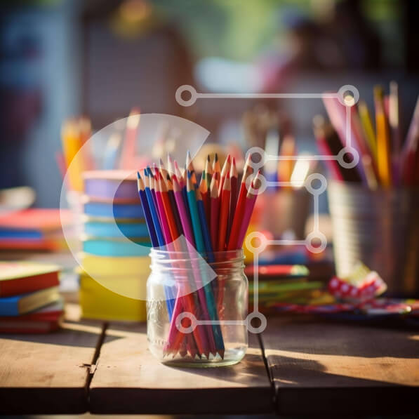 Intra Συλλεκτικό Ξύλινο Παζλ Plywood 4mm – Πολύχρωμα είδη γραφικής ύλης και σημειωματάρια σε ένα ξύλινο τραπέζι Σε Ξύλινο Κουτί – Διαστάσεις: 10×10 cm – 25 κομμάτια
