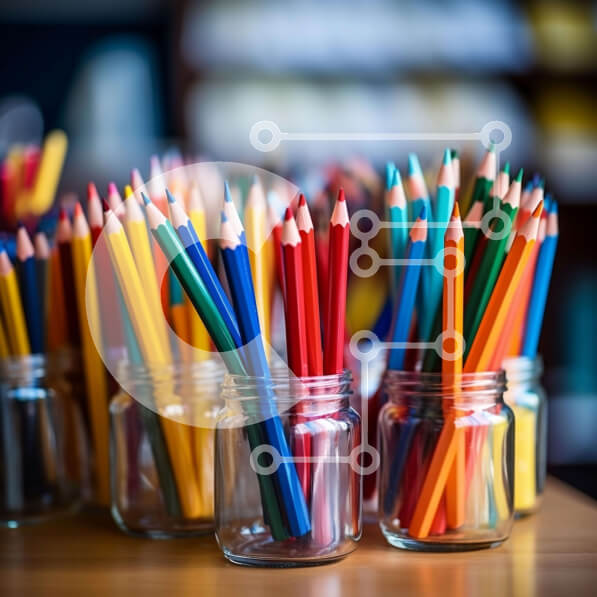 Intra Συλλεκτικό Ξύλινο Παζλ Plywood 4mm – Πολύχρωμα μολύβια σε γυάλινα βάζα σε ξύλινο τραπέζι Σε Ξύλινο Κουτί – Διαστάσεις: 10×10 cm – 25 κομμάτια