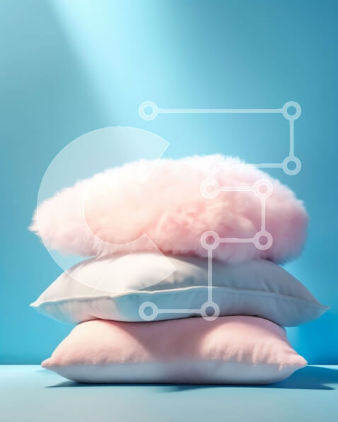 Intra Συλλεκτικό Ξύλινο Παζλ Plywood 4mm – Πολύχρωμα και άνετα: Στοίβα από ροζ και λευκά μαξιλάρια σε μπλε φόντο Σε Ξύλινο Κουτί – Διαστάσεις Puzzle: 10×10 cm – 25 κομμάτια