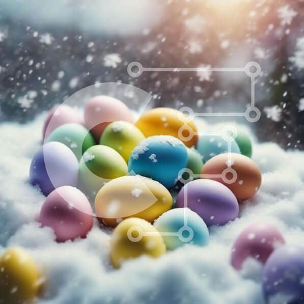 Intra Συλλεκτικό Ξύλινο Παζλ Plywood 4mm – Πολύχρωμα Πασχαλινά αυγά στο χιόνι με τις νιφάδες χιονιού που πέφτουν Σε Ξύλινο Κουτί – Διαστάσεις: 10×10 cm – 25 κομμάτια