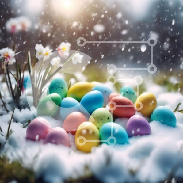Intra Συλλεκτικό Ξύλινο Παζλ Plywood 4mm – Πολύχρωμα Πασχαλινά αυγά στο χιόνι με λουλούδια και πράσινο γρασίδι Σε Ξύλινο Κουτί – Διαστάσεις: 10×10 cm – 25 κομμάτια