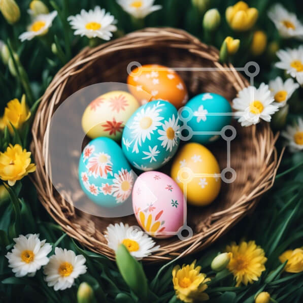 Intra Συλλεκτικό Ξύλινο Παζλ Plywood 4mm – Πολύχρωμα βαμμένα Πασχαλινά αυγά και μαργαρίτες στο καλάθι με χόρτο Σε Ξύλινο Κουτί – Διαστάσεις: 10×10 cm – 25 κομμάτια