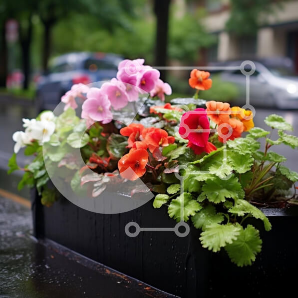 Intra Συλλεκτικό Ξύλινο Παζλ Plywood 4mm – Πολύχρωμα λουλούδια σε μαύρο φυτευτή στην αστική οδό Σε Ξύλινο Κουτί – Διαστάσεις: 10×10 cm – 25 κομμάτια