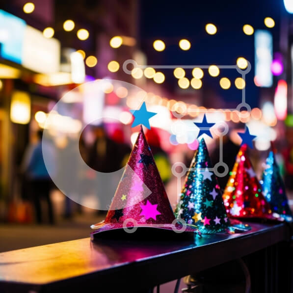 Intra Συλλεκτικό Ξύλινο Παζλ Plywood 4mm – Πολύχρωμα καπέλα πάρτι σε έναν ξύλινο πάγκο σε έναν αστικό δρόμο τη νύχτα Σε Ξύλινο Κουτί – Διαστάσεις Puzzle: 10×10 cm – 25 κομμάτια