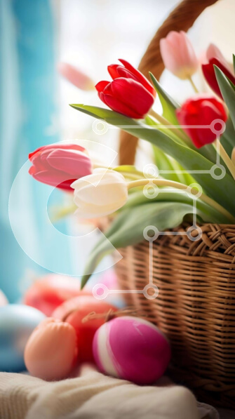 Intra Συλλεκτικό Ξύλινο Παζλ Plywood 4mm – Πολύχρωμες τουλίπες και αυγά Πάσχας σε ένα καλάθι σε ξύλινο τραπέζι Σε Ξύλινο Κουτί – Διαστάσεις: 10×10 cm – 25 κομμάτια