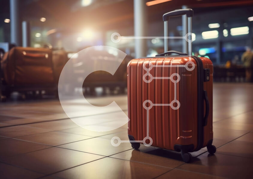 Intra Συλλεκτικό Ξύλινο Παζλ Plywood 4mm – Πορτοκαλί βαλίτσα στον τερματικό σταθμό του αεροδρομίου Σε Ξύλινο Κουτί – Διαστάσεις Puzzle: 10×10 cm – 25 κομμάτια