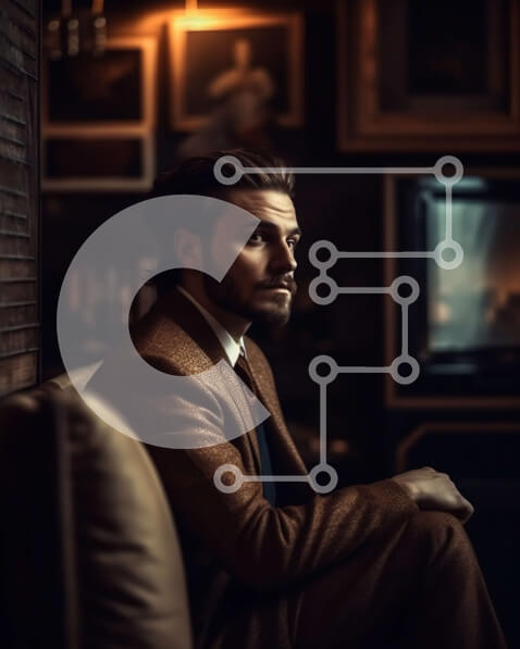 Intra Συλλεκτικό Ξύλινο Παζλ Plywood 4mm – Πορτρέτο ενός άνδρα με καφέ κοστούμι και γραβάτα που κάθεται σε έναν καναπέ σε ένα δωμάτιο με χαμηλό φωτισμό Σε Ξύλινο Κουτί – Διαστάσεις Puzzle: 10×10 cm – 25 κομμάτια