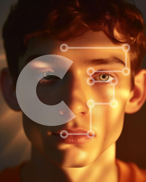 Intra Συλλεκτικό Ξύλινο Παζλ Plywood 4mm – Πορτρέτο ενός νεαρού άνδρα με φωτεινά μπλε μάτια και ένα πορτοκαλί πουκάμισο Σε Ξύλινο Κουτί – Διαστάσεις Puzzle: 10×10 cm – 25 κομμάτια