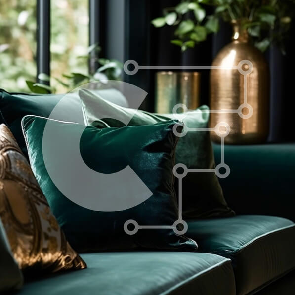 Intra Συλλεκτικό Ξύλινο Παζλ Plywood 4mm – Πράσινος βελούδινος καναπές μπροστά από το μεγάλο παράθυρο με θέα στον ορίζοντα της πόλης Σε Ξύλινο Κουτί – Διαστάσεις Puzzle: 10×10 cm – 25 κομμάτια