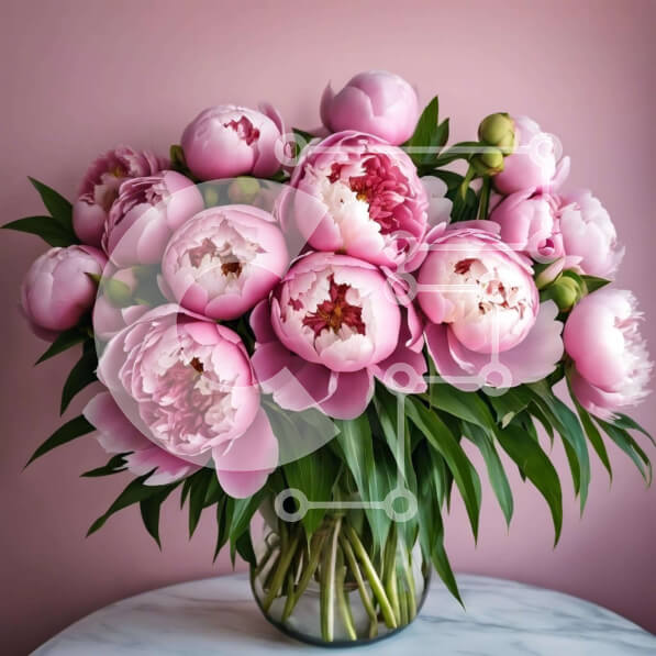 Intra Συλλεκτικό Ξύλινο Παζλ Plywood 4mm – Ροζ παιώνιες σε γυάλινο βάζο σε μαρμάρινο τραπέζι Σε Ξύλινο Κουτί – Διαστάσεις: 10×10 cm – 25 κομμάτια
