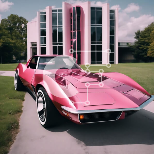 Intra Συλλεκτικό Ξύλινο Παζλ Plywood 4mm – Ροζ σπορ αυτοκίνητο σταθμευμένο μπροστά από το σύγχρονο κτήριο Σε Ξύλινο Κουτί – Διαστάσεις Puzzle: 10×10 cm – 25 κομμάτια