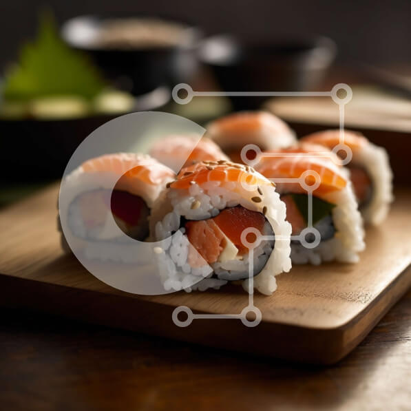 Intra Συλλεκτικό Ξύλινο Παζλ Plywood 4mm – Ρολό σούσι με σολομό, αβοκάντο και αγγούρι σε ξύλινη σανίδα κοπής Σε Ξύλινο Κουτί – Διαστάσεις: 10×10 cm – 25 κομμάτια