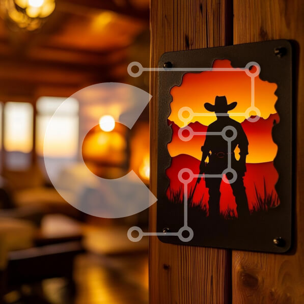 Intra Συλλεκτικό Ξύλινο Παζλ Plywood 4mm – Σιλουέτα ενός καουμπόη ενάντια στο ηλιοβασίλεμα σε ρουστίκ καμπίνα Σε Ξύλινο Κουτί – Διαστάσεις Puzzle: 10×10 cm – 25 κομμάτια