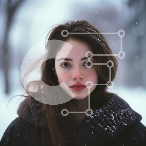Intra Συλλεκτικό Ξύλινο Παζλ Plywood 4mm – Σοβαρή νεαρή γυναίκα στο χιόνι με μακριά σκούρα μαλλιά και καστανά μάτια Σε Ξύλινο Κουτί – Διαστάσεις Puzzle: 10×10 cm – 25 κομμάτια