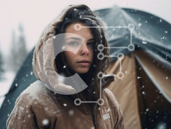 Intra Συλλεκτικό Ξύλινο Παζλ Plywood 4mm – Σοβαρή νεαρή γυναίκα που στέκεται στο χιόνι με τη λευκή σκηνή στο φόντο Σε Ξύλινο Κουτί – Διαστάσεις Puzzle: 10×10 cm – 25 κομμάτια