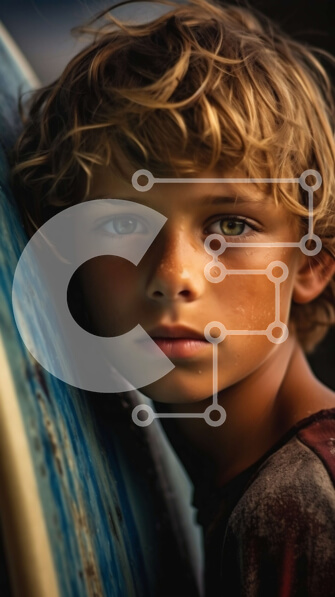 Intra Συλλεκτικό Ξύλινο Παζλ Plywood 4mm – Σοβαρό νεαρό αγόρι που ποζάρει μπροστά από μια μπλε σανίδα του σερφ Σε Ξύλινο Κουτί – Διαστάσεις Puzzle: 10×10 cm – 25 κομμάτια