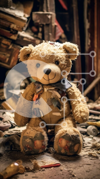 Intra Συλλεκτικό Ξύλινο Παζλ Plywood 4mm – Σπαρακτική εικόνα ενός γεμισμένου αρκουδάκι σε ένα κατεστραμμένο δωμάτιο Σε Ξύλινο Κουτί – Διαστάσεις: 10×10 cm – 25 κομμάτια