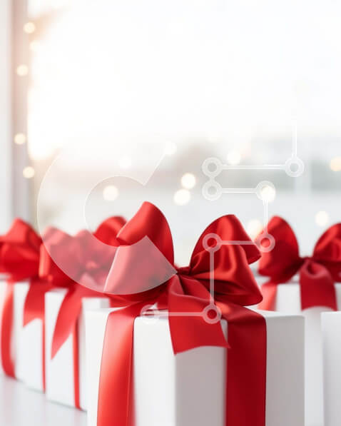 Intra Συλλεκτικό Ξύλινο Παζλ Plywood 4mm – Τέσσερα λευκά κουτιά δώρων με κόκκινους φιόγκους σε ένα τραπέζι Σε Ξύλινο Κουτί – Διαστάσεις Puzzle: 10×10 cm – 25 κομμάτια