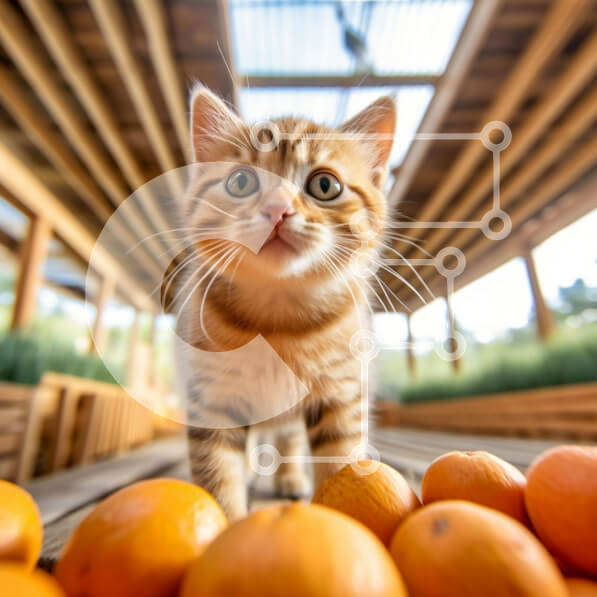 Intra Συλλεκτικό Ξύλινο Παζλ Plywood 4mm – Το χαριτωμένο γατάκι ποζάρει με την πυραμίδα των πορτοκαλιών σε άνετο ξύλινο πάτωμα Σε Ξύλινο Κουτί – Διαστάσεις: 10×10 cm – 25 κομμάτια