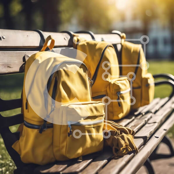 Intra Συλλεκτικό Ξύλινο Παζλ Plywood 4mm – Τρία κίτρινα σακίδια πλάτης στον ξύλινο πάγκο στο πάρκο Σε Ξύλινο Κουτί – Διαστάσεις Puzzle: 10×10 cm – 25 κομμάτια